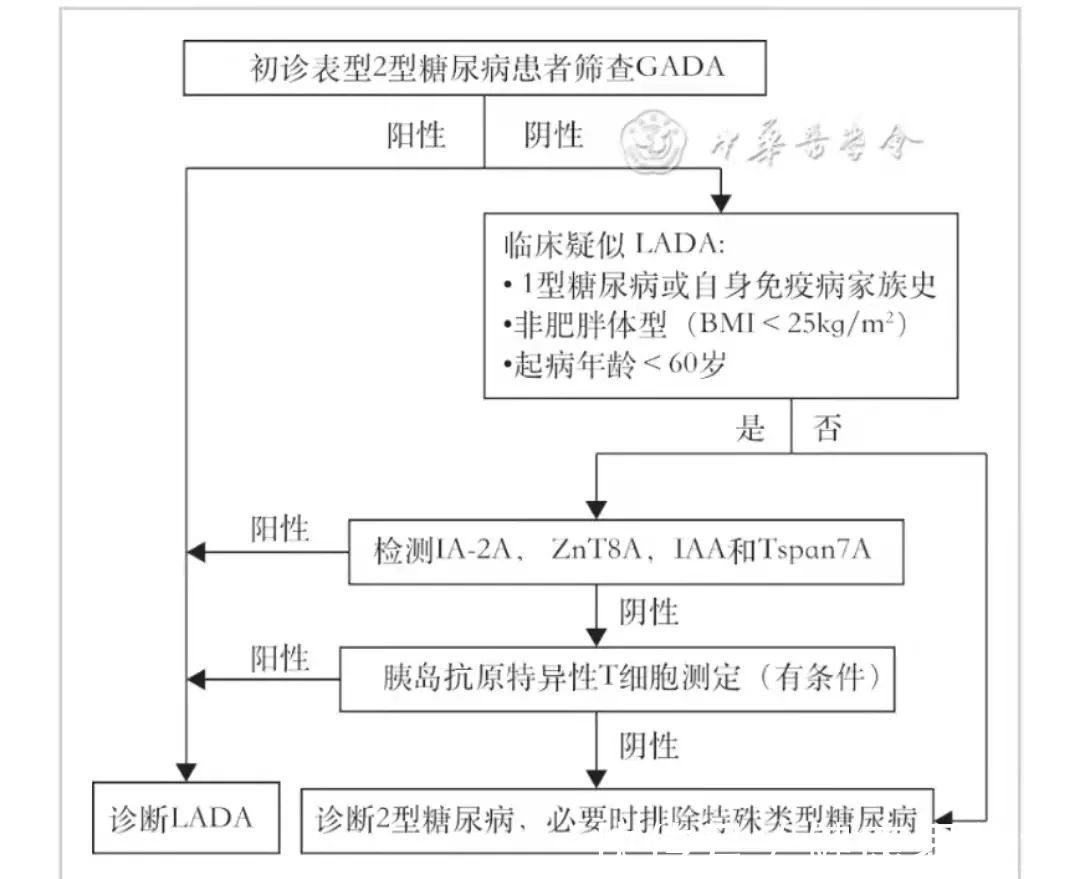 如果考虑成本和检测可及性,建议选择具有LADA高危因素的糖尿病患者进行抗体筛查。LADA高危者可伴有以下临床特征:有TIDM或自身免疫病家族史、非肥胖体型(BMI<25kg/m2)、起病年龄小于60岁。具体诊断路径如下图所示: