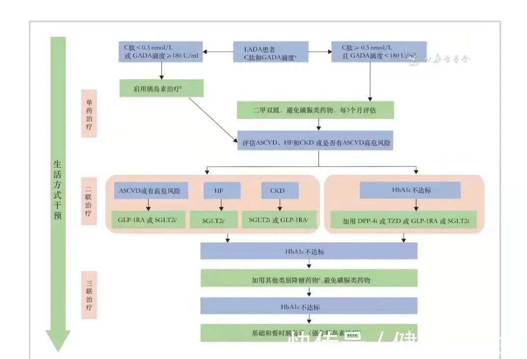LADA随访管理:由于LADA胰岛β细胞功能减退呈先快后慢双相模式,建议对有一定胰岛功能者,每6~12月复查1次C肽水平。对病程5年以上患者,至少每年做1次全面的并发症筛查。