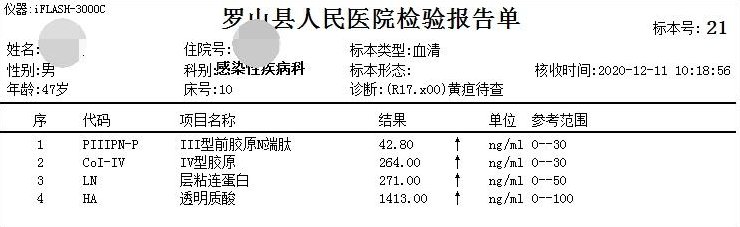 肝纤维四项检测指标患者远远超出正常参考范围,其中玻尿酸ic酸(HA)能灵敏反映肝脏中已产生的纤维量,肝细胞损伤是肝纤维化和肝硬化的敏感指标;
