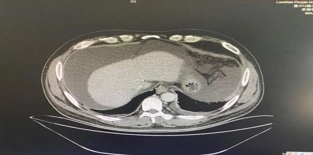 患者,男,47岁,发现双眼巩膜黄染,腹胀1个月。他接受了上腹部 CT(平扫):腹水;左侧胸膜腔有少量积液;门诊入院为1.待查黄疸2.肝功能不全”。