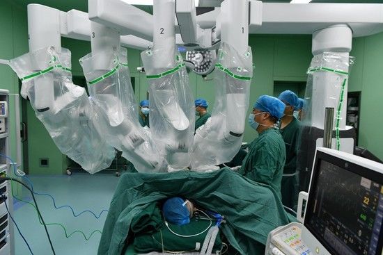 2020年6月16日,石家庄,在河北省胸科医院手术室内,医生正在使用一台“三头四臂”的第四代达芬奇手术机器人对患者实施治疗。视觉中国供图(资料配图)